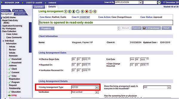 On the Living Arrangement page, select ICF / ID for the Living Arrangement Type.