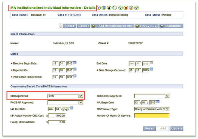 On the MA Institutionalized Individual Information - Details page, enter CBC details.