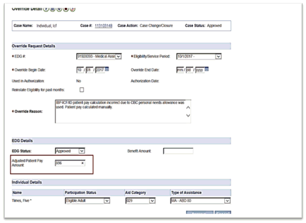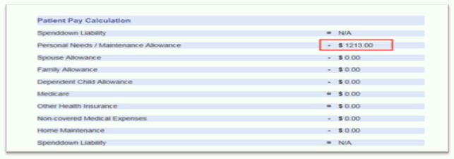 7. Manually calculate the correct patient pay using the NH personal needs allowance and enter the correct patient pay in the Adjusted Patient Pay Amount field.