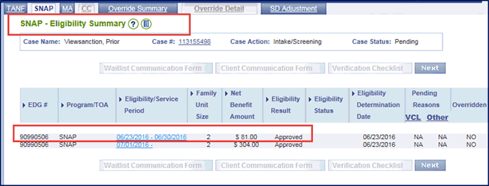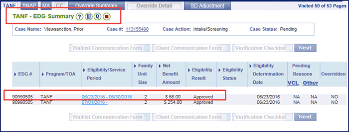 Follow the process below to override the TANF results to the countable amount for SNAP and suspend TANF months: